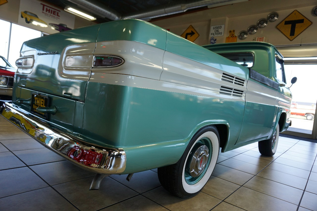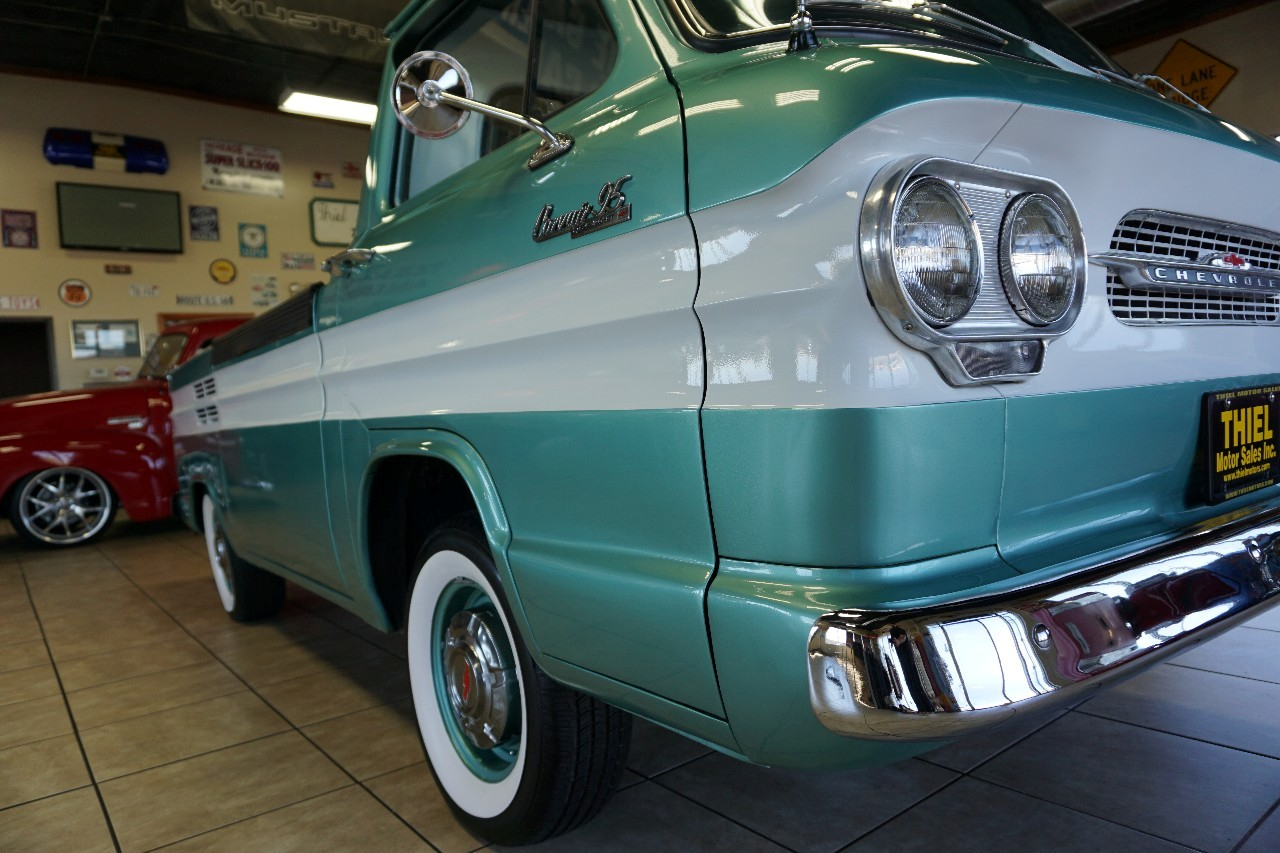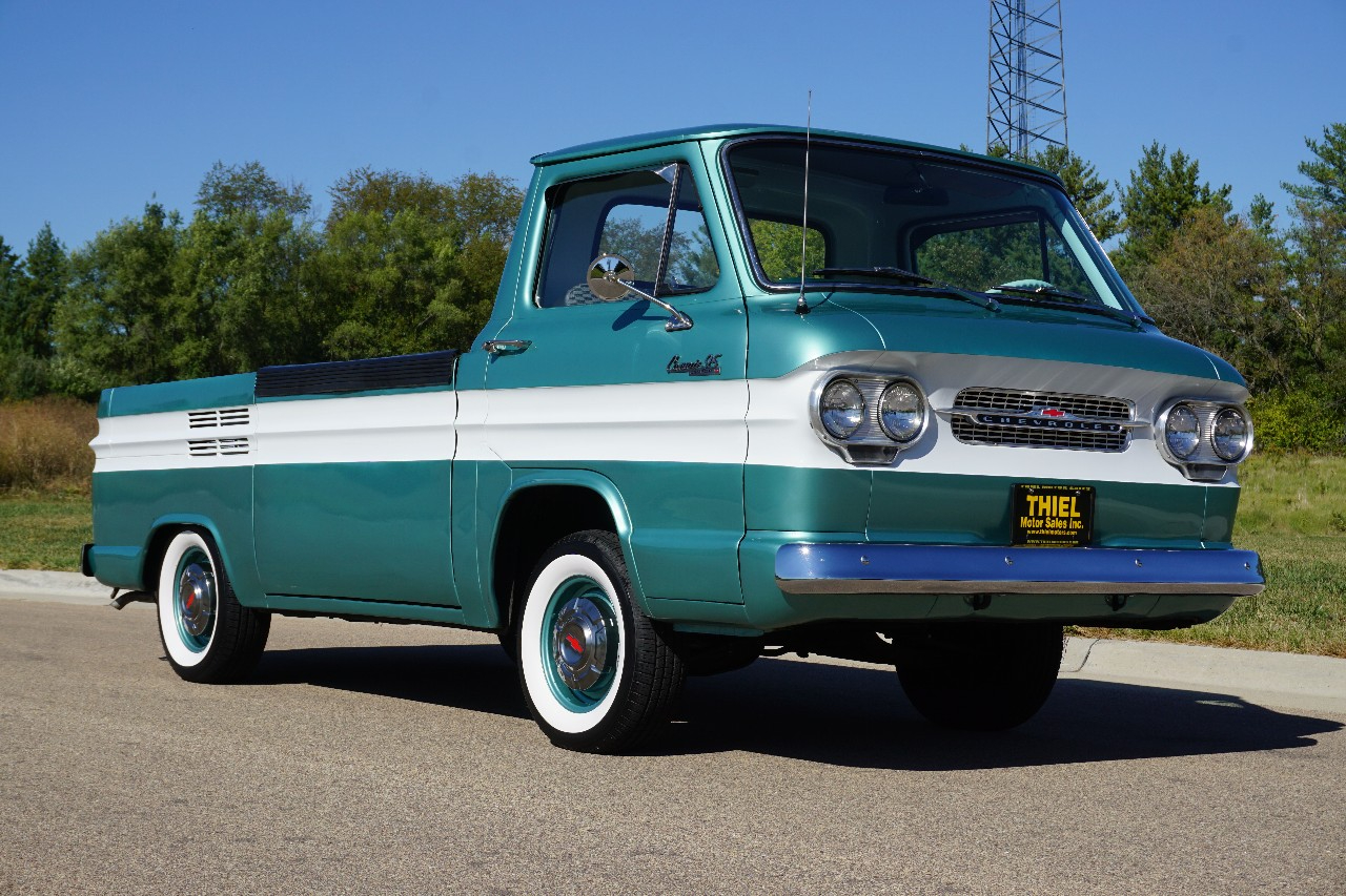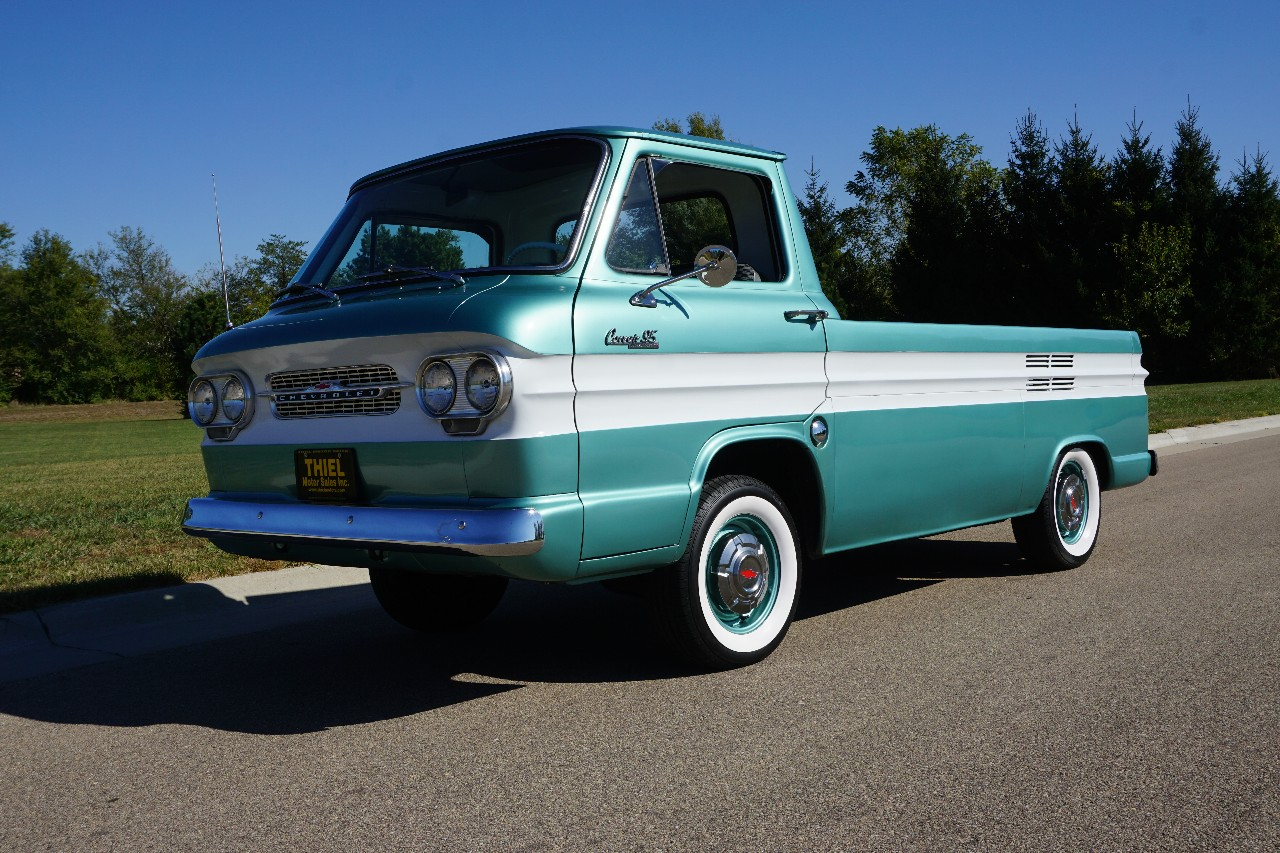 JUST IN — and talk about RARE! This 1961 Chevrolet Corvair 95 Rampside Pickup is a true piece of Chevrolet history — the first year ever built! Finished in a stunning Light Mint Metallic & White two-tone, it sports color-matched steel wheels, dog dish hubcaps, and wide whitewall tires for that perfect period-correct look. Under the rear deck sits the legendary Flat 6-Cylinder Engine paired with a rare 4-speed manual transmission. FULLY RESTORED in 2016, this Rampside is ready to serve as a fun weekend driver, eye-catching showpiece, or rolling billboard for your business. Whether it’s in a parade, at a car show, or parked outside the hardware store, this truck is guaranteed to grab attention everywhere it goes.